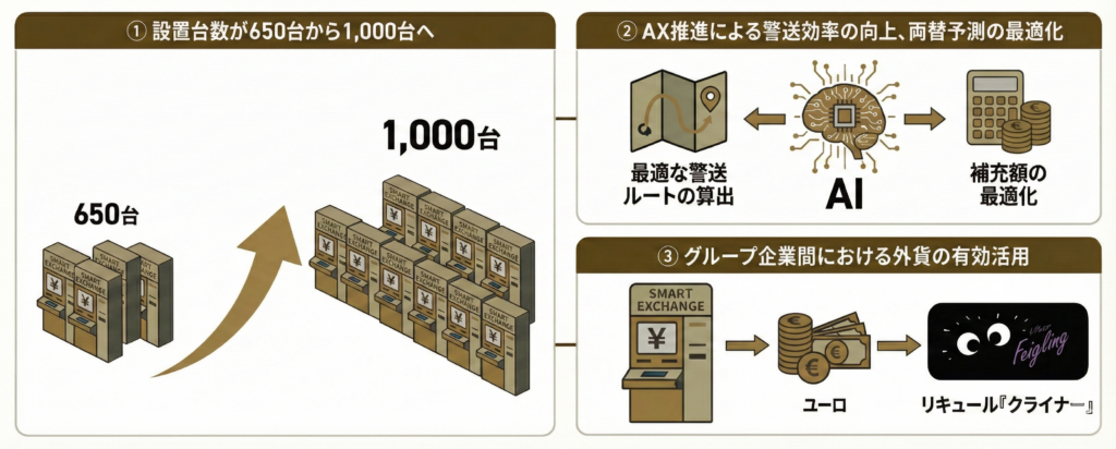 株式会社GENDA(本社:東京都港区、代表取締役社長CEO:片岡 尚、以下「当社」)のグループ企業である株式会社SMART EXCHANGE(本社:東京都港区、代表取締役:中野 雅人、以下「SMART EXCHANGE」)が国内で展開する外貨両替機の設置台数が1,000台を突破したことをお知らせいたします。SMART EXCHANGEの外貨両替機は主にコンビニ、ホテル、ショッピングセンター、アミューズメント施設など様々な場所に設置しており、日本を訪れる多くの観光客のみなさまにご利用いただいております。SMART EXCHANGEでは、日本のエンターテイメントを楽しむために必要不可欠な外貨両替機の設置台数を今後も積極的に増やしてまいります。