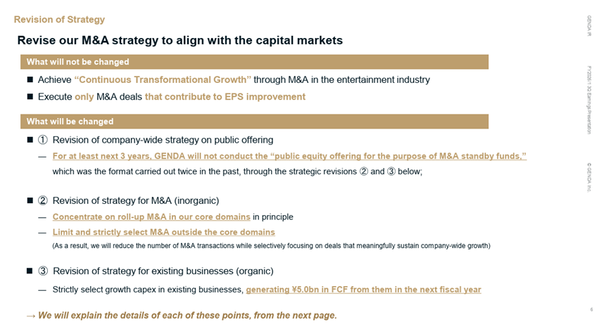 First is the company-wide strategic shift regarding public offerings. We have established a policy that we will not conduct any “public offerings for the purpose of securing M&A standby funds” – a practice we carried out twice in the past – for at least the next three years.