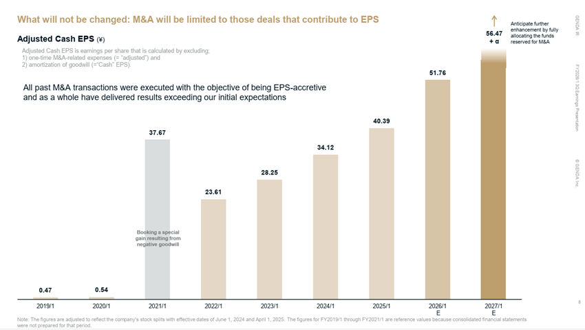 Our annual cash-in amount, equivalent to EBITDA, is currently approximately 27.0 billion yen (equivalent to the company’s planned EBITDA for the fiscal year ending on January 31, 2027). We will leverage this significant annual cash inflow to its full potential to pursue continuous M&A, all while reducing the strain on the capital markets. This will be accomplished by funding M&A with our own cash flow, initiating debt repayment to increase our debt capacity, and conducting disciplined, stock-based M&A.