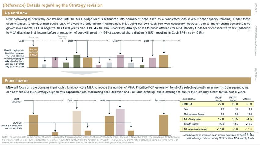Until now, we have executed M&A at a rapid pace across a diverse range of entertainment companies. In practice, our new financing could not keep pace with such a high volume of deals despite our remaining debt capacity, necessitating the use of our own cash reserves. Simultaneously, we were aggressively reinvesting in our existing businesses for comprehensive growth, as detailed below, which resulted in a deliberate negative Free Cash Flow (FCF).